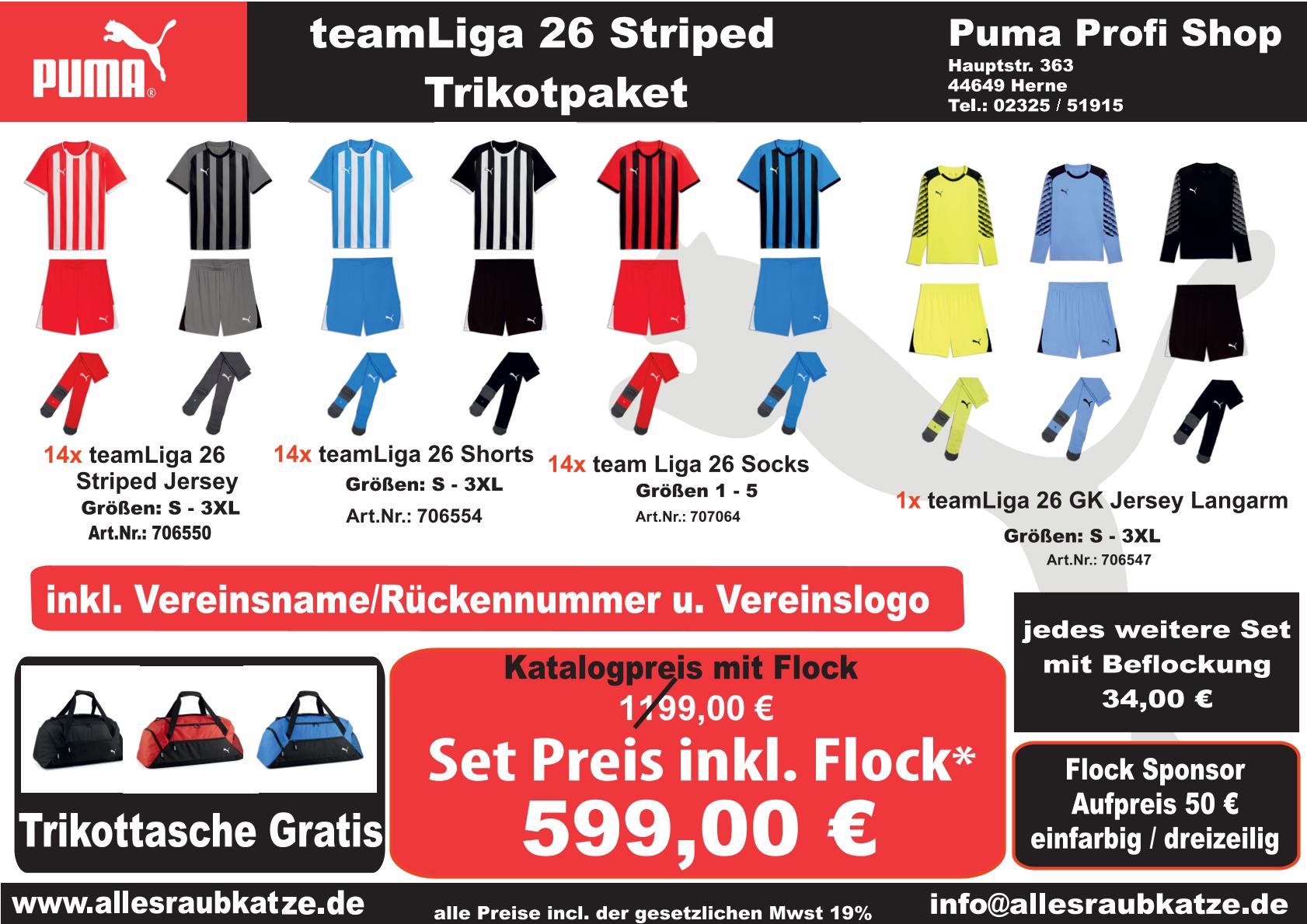| Das gelungene Design macht eine gute Figur auf dem Platz und in der Halle, die Shirts sind optimal geeignet für Ihre individuelle Beflockung mit Vereínsnamen, Rückennummern,Spielername und Sponsor. Die Puma Striped Trikot`s sind optisch ein echter Hingucker, bieten hochwertige Qualität (hohe Atmungsaktivität, angenehm leichtes Mikrofaser Gewebe), wir bieten Ihnen das komplette Trikotpaket zu einem sehr guten Preis-/Leistungsverhältnis an.